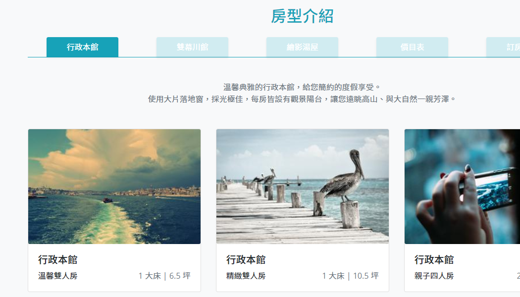 使用導覽列、輪播、卡片、摺疊等Bootstrap功能,製作出一個飯店的一頁式網站,包含了響應式網頁(RWD)功能,是一份專門用來練習Bootstrap的作品。網站照片使用Picsum隨機生成,所以與文字顏色可能會不協調。