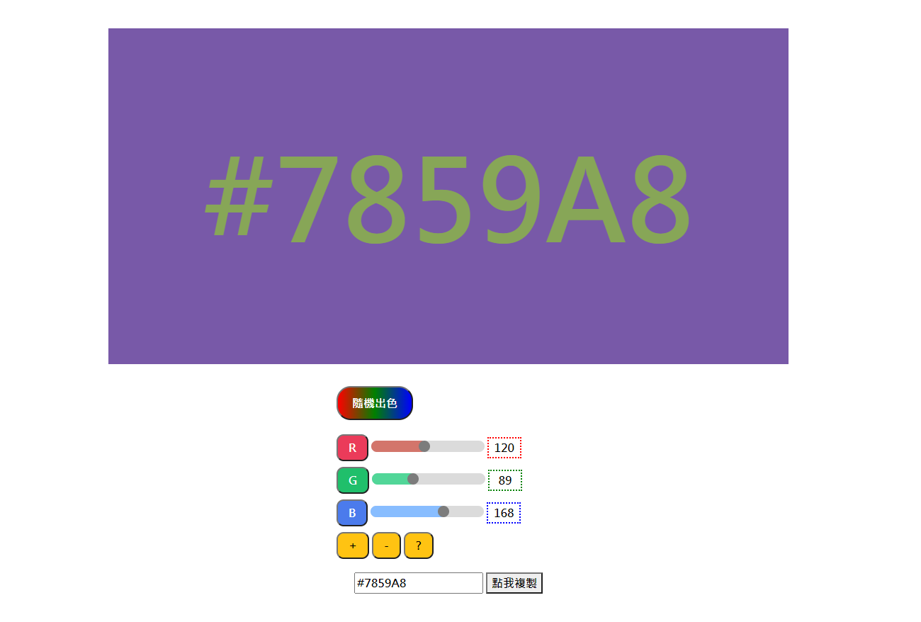使用JavaScript各種功能產生隨機顏色,也可自行使用Input表單輸入、Range拉條調整RGB數值,任何一項數值的變動同時都會改變所有其他欄位的Value值,並製作複製按鈕可立即複製該顏色HEX色碼
